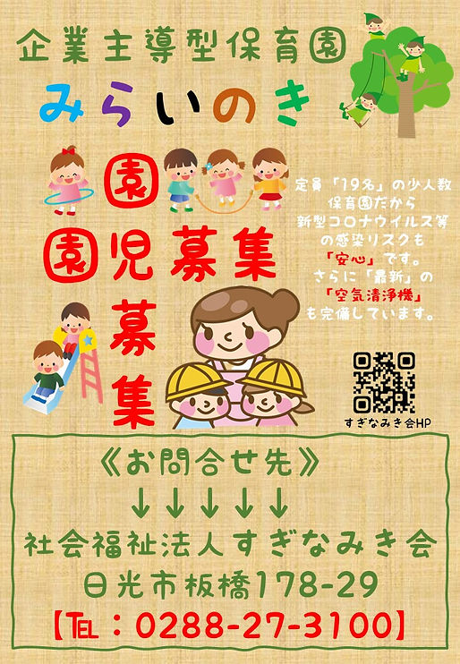 みらいのきは内閣府所管の「企業主導型保育事業」による国の助成金を利用した認可外保育園です。助成を受けている為、保育士の配置、保育施設等は認可並の整備となります。