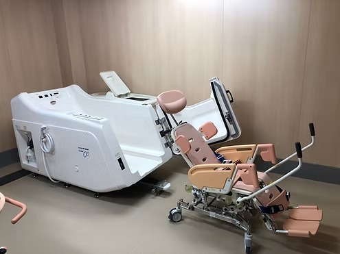 既存の特殊浴槽は従来はストレッチャー式ですが、今回整備した特殊浴槽は座浴式です