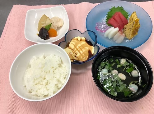 内容は、ご飯、お刺身盛り合わせ、炊き合わせ、すまし汁、プリンです✨