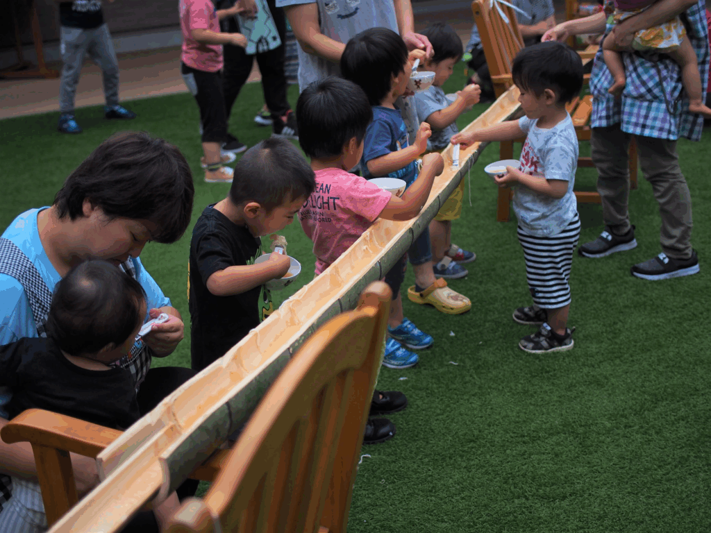 はじめて見る流しそうめんの竹にみんな大興奮!