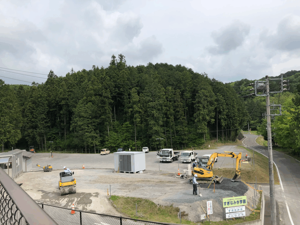 すぎなみき学園では、今まで砂利作業棟周辺及び夜勤者が車を駐車する箇所を中心に舗装工事が始まりました👷