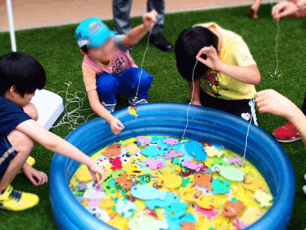 ボール入れはちょっと難しかったのか、近くに行ってボールを入れるお友達がいたり、さかな釣りゲームでは手づかみで取るお友達がいたりと、大盛り上がりだったようです。