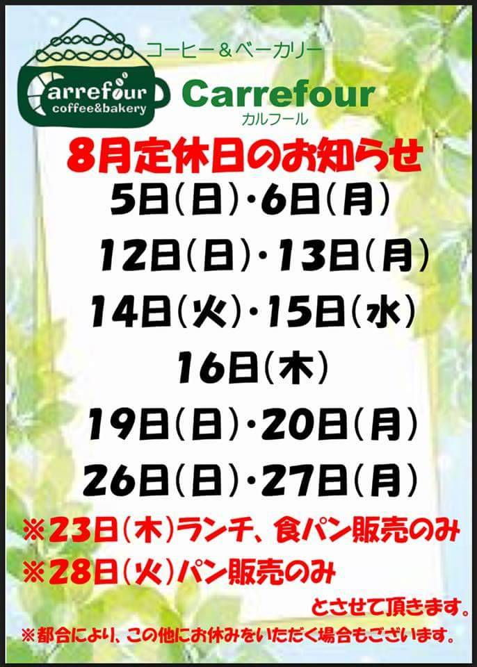 8月のカルフールのお休みとその他の情報をお知らせします。