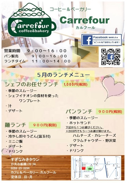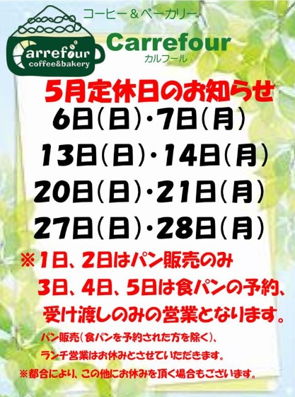 早速ですが、5月のカルフールのランチメニューと定休日のお知らせです。