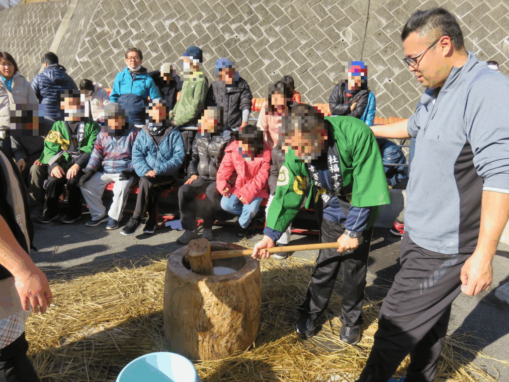 男性職員と利用者の皆さんで協力しながらお餅をつき、
