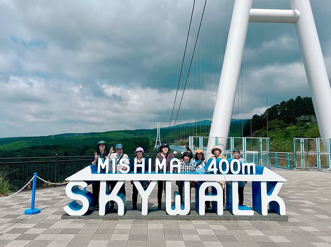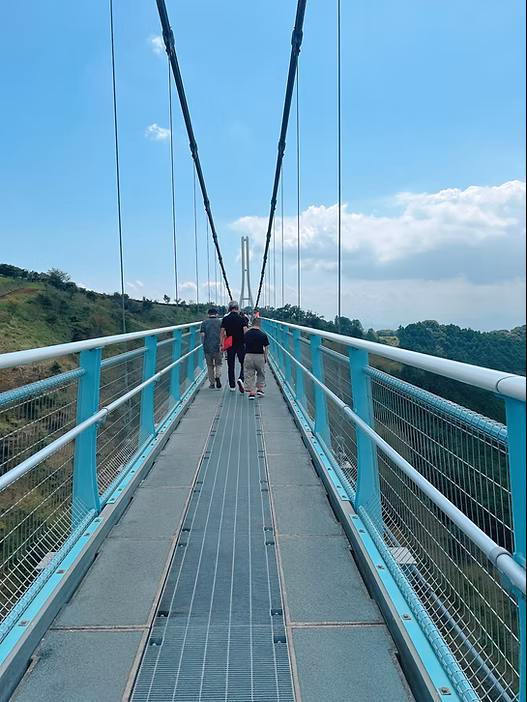 ながーいつり橋に挑戦!『怖いけど渡ってみる!』と一歩一歩進む方もいれば、橋は渡らず絶景とアイスを楽しむ方も。