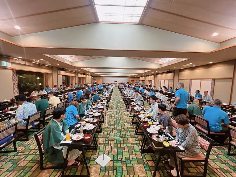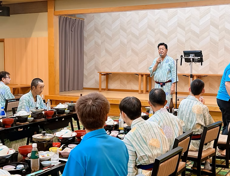 宿泊はホテル天坊。今回は貸し切りで、みなさんおもいっきりリラックスした様子。