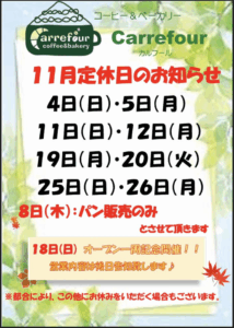 こんにちは すぎなみき会のTです。 今朝は今シーズン一番の冷え込みということでヒンヤリした朝でしたね。 すぎなみき学園うっすらと霜が降りていましたよ。 さて、カルフールから11月のお知らせです。 11月も皆様のお越しお待 […]